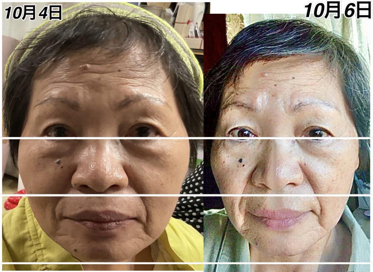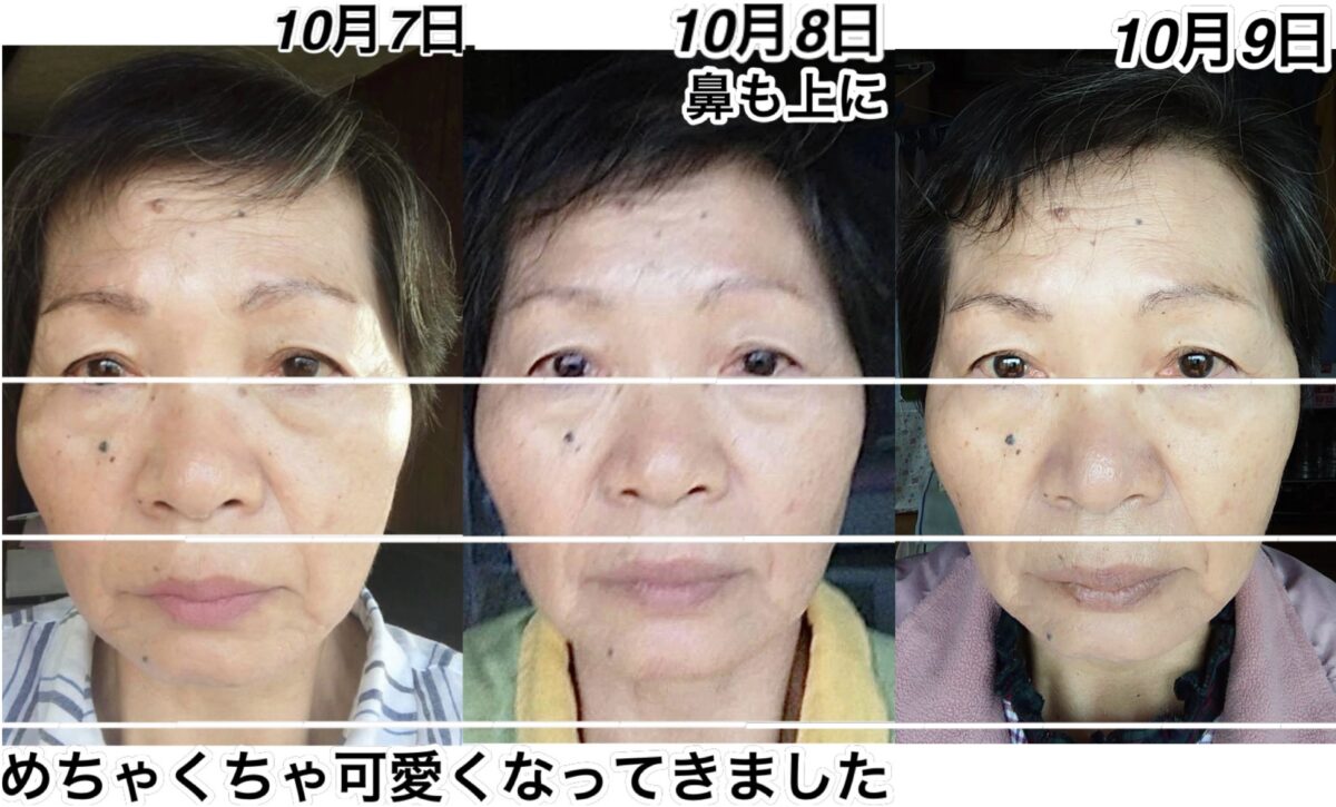 一日で、鼻が上がり、アゴが小さくなっているので、次は横に細くなりますよ。楽しみですね。そろそろ人生が変わったのではないでしょうか。