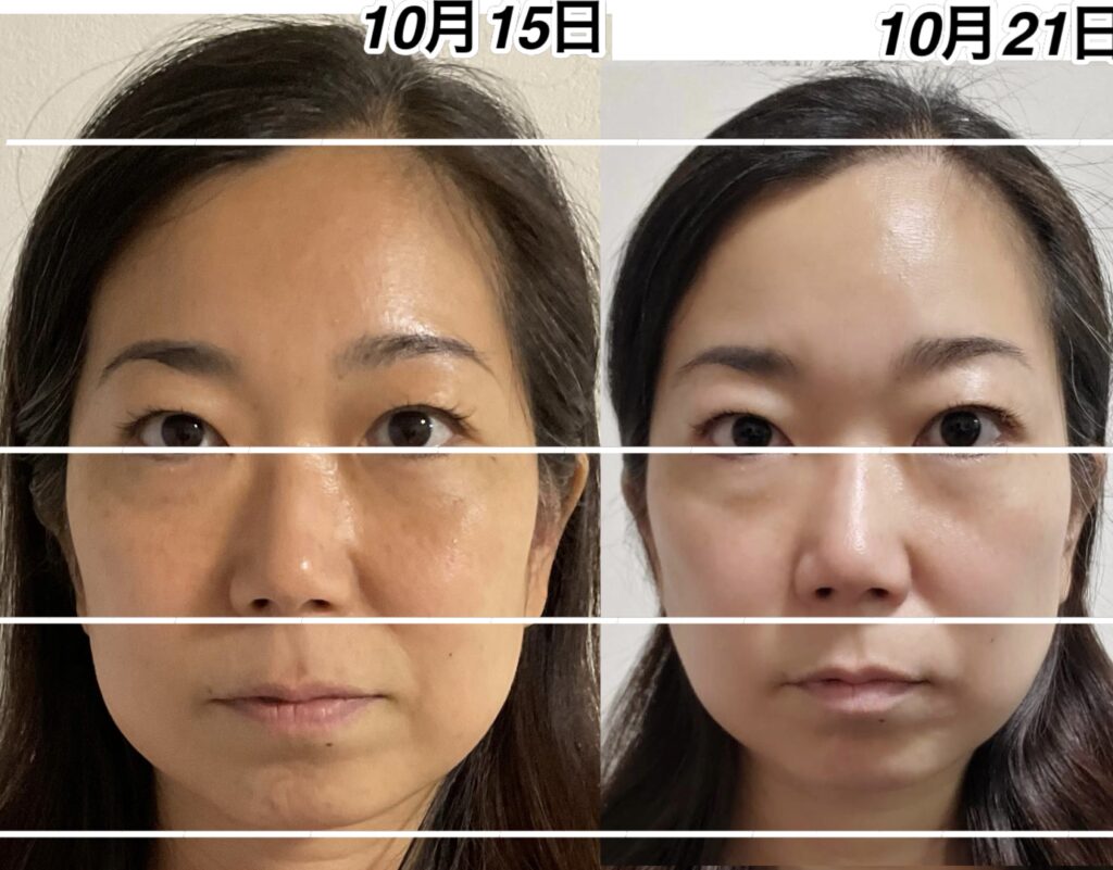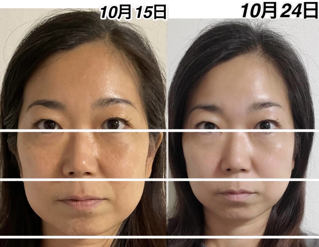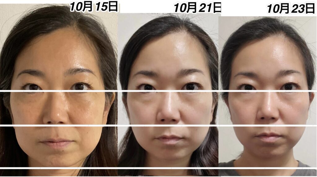 10月15日の酸化したお顔をよく見ていただけると、10月24日のお顔がいかに抗酸化しているかが分かります。