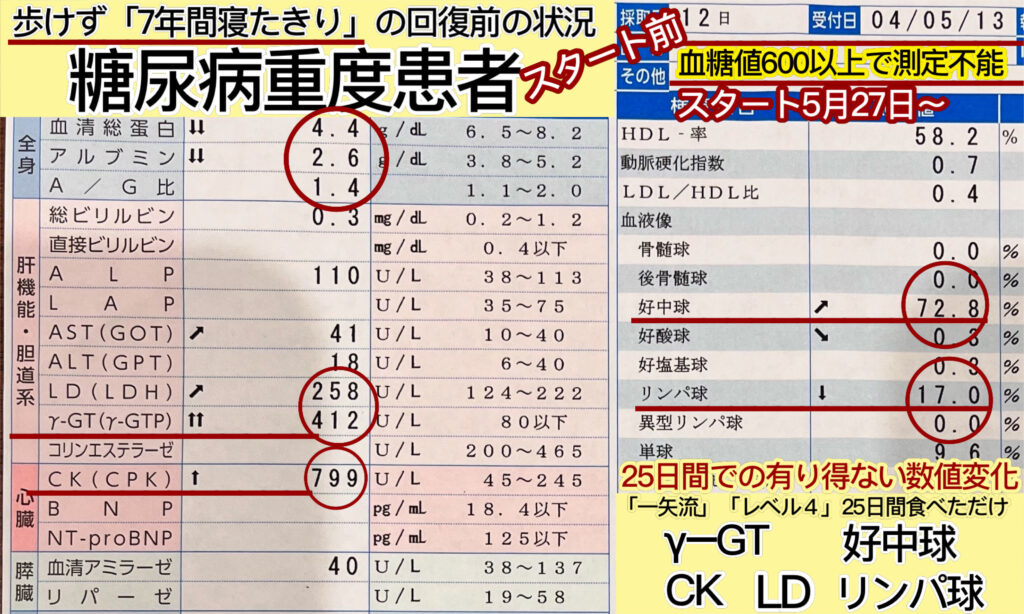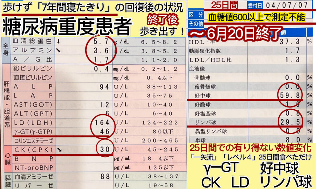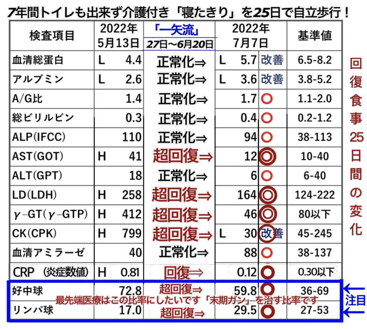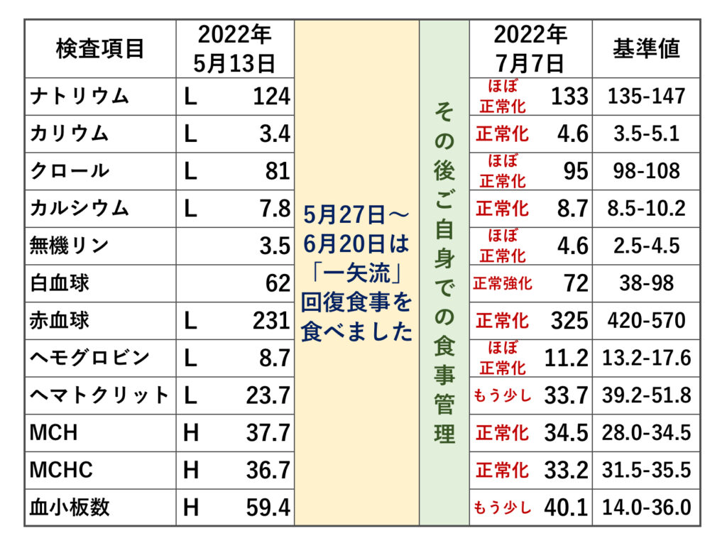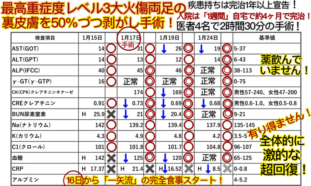 この大火傷のおかげで、入院を1週間し、その後、約4か月間、自分自身で実験する事が出来るようになり、「一矢流」の食事は、完全に血液検査数値項目をコントロールできるようになり、成功し完成しました。