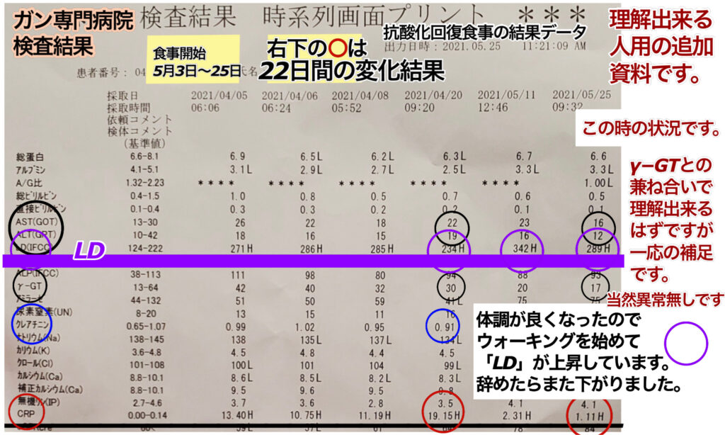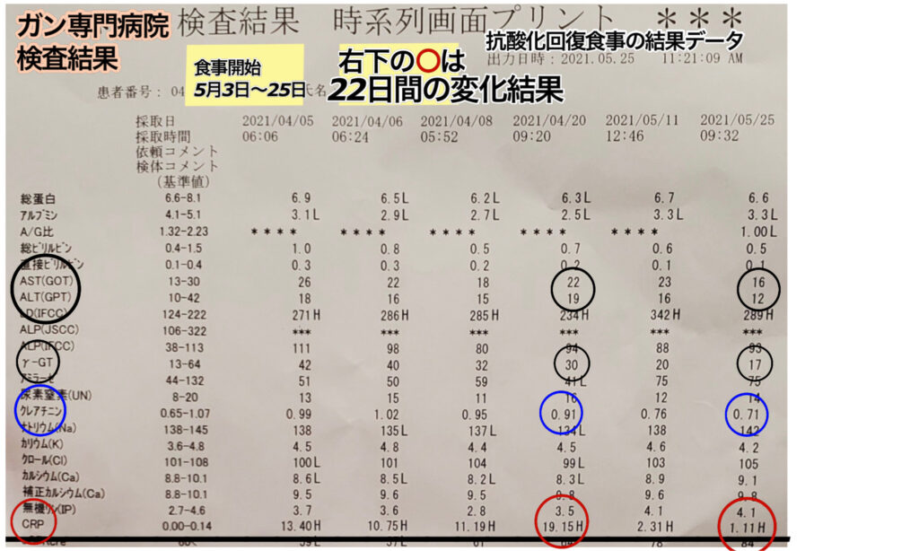 肝臓が機能アップして更に良くなり、腎臓機能もより機能を回復してきて、ガンという炎症の数値を正常化しているのが見て取れる証明の検査結果になります。