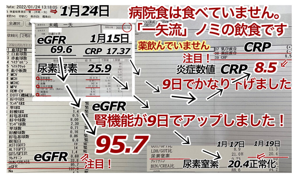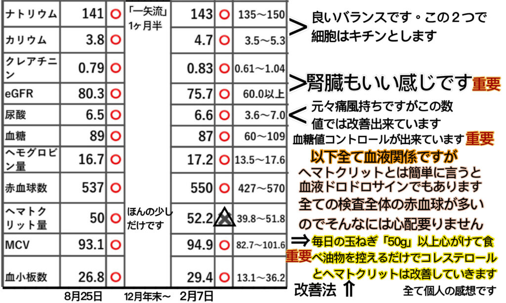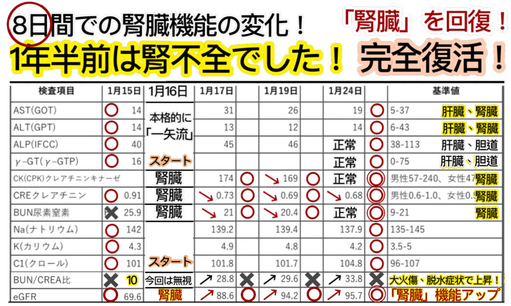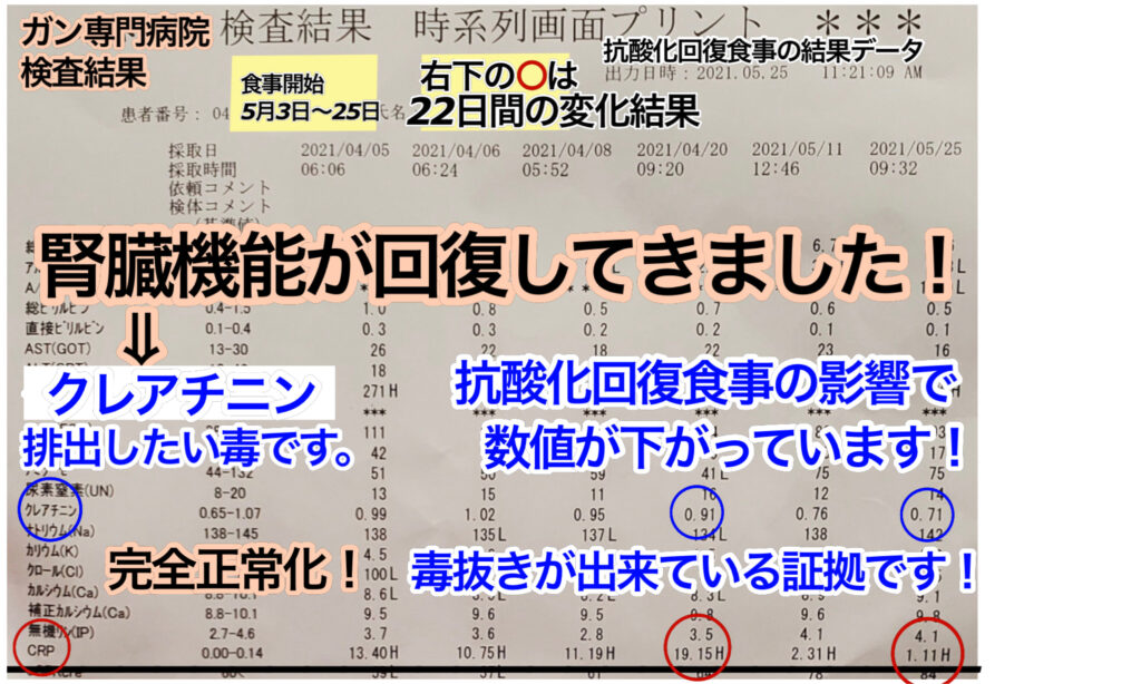 ⬆︎上の写真の青い丸に注目してください。「クレアチニン」の数値ですが、この数値は、腎臓の毛細血管が詰まっていて腎機能が低下すると上がっていきます。腎臓の毛細血管の中が掃除出来た事が分かります。この数値が高い人は、おしっこを作る事が出来にくくなります。毒が排出されず体内に残っている状態になります。とても危険な状態です。腎臓病や腎不全がそれに該当します。こんなに早く腎臓は通常は改善しません。「一矢流」の「抗酸化回復食事」ならではの事です。
