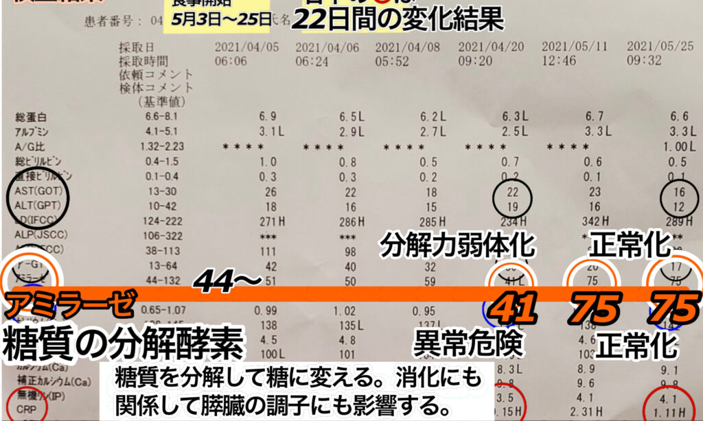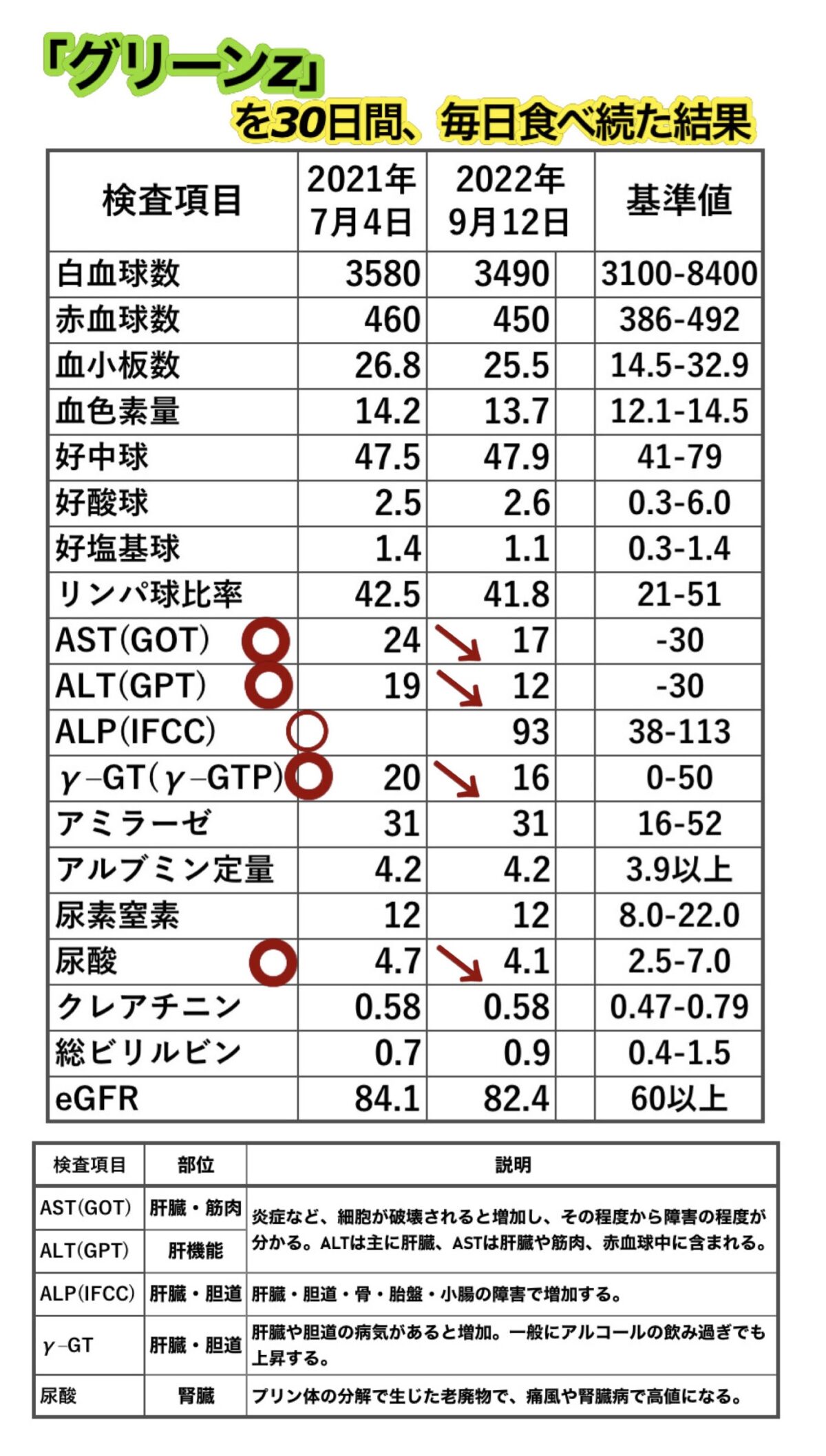 元々全てに異常はなく、基準値以内の血液検査結果でしたが、肝臓周辺の重要数値たちが改善している事が分かります。