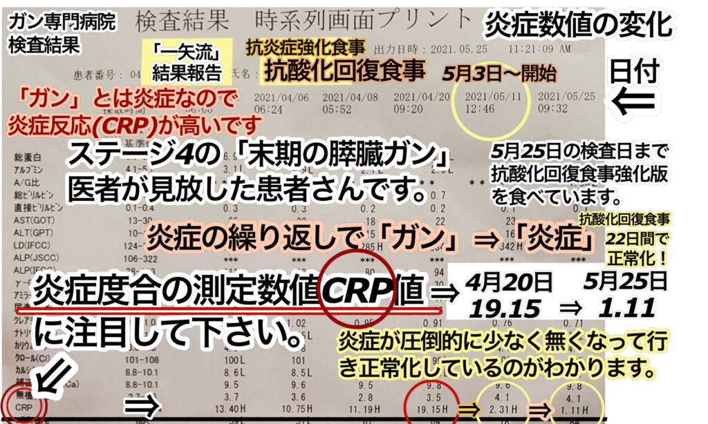 「酸化」は「老化」で「炎症」。「炎症」の繰り返しで「発ガン」。その「炎症」を血液検査で調べた時の「数値」の変化が『CRP値』。虫歯・怪我・打撲・手術でも身体のどこかが「炎症」を起こすと、この「数値」は反応し上がります。血液反応なので1時間半〜3時間後にはすぐに反応数値として上がっています。このCRP値は、全ての「炎症」に反応をするので、ガンなどを見極める時も、この数値を重要視します。手術をした後など、傷が完治していない場合には当然この「数値」が上がっていますので、治ったか治らないかの判断はこの数値で確認をします。この「CRP」という数値を食事を食べただけで、もしくは塗っただけで、下げる事を可能にしたのが「一矢流」の商品達です。
