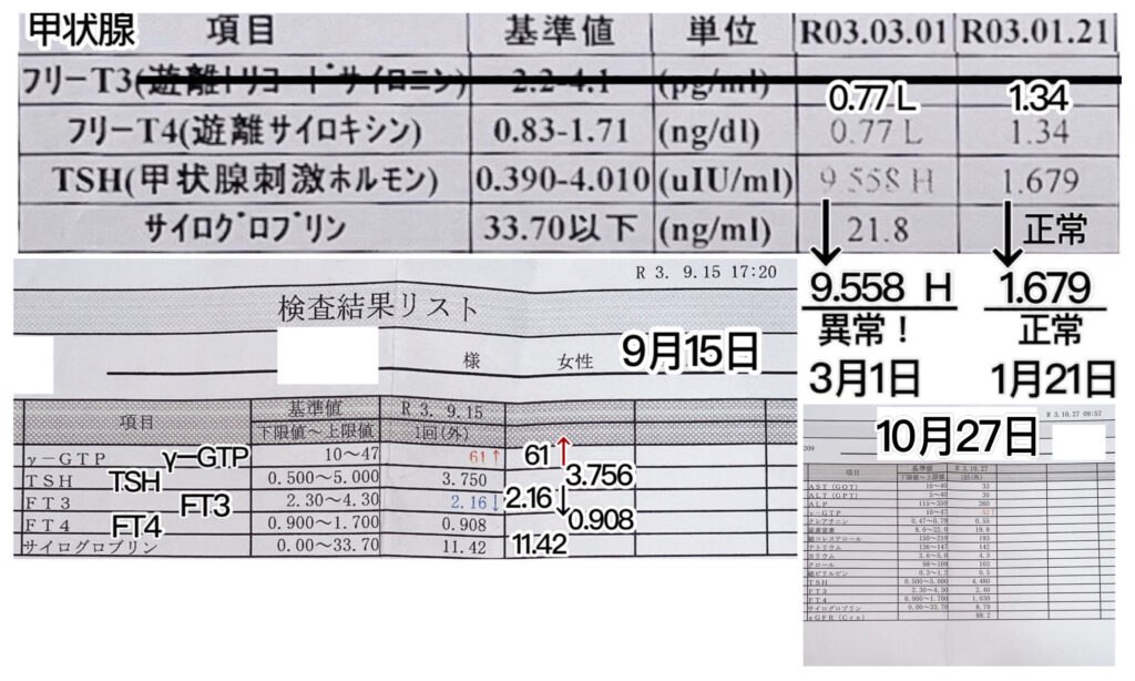 上の血液検査の結果を整理して記述したのが一番上の表になります。一度「ハシモト」病は治っていたのですが、食生活の乱れにより、再度振り返しましたが、再度食生活を正して、「81z・16zセット」をきちんと飲み、3ヶ月で再度正常化しました。下の表は、それ以前のものになります。ご参考までに。