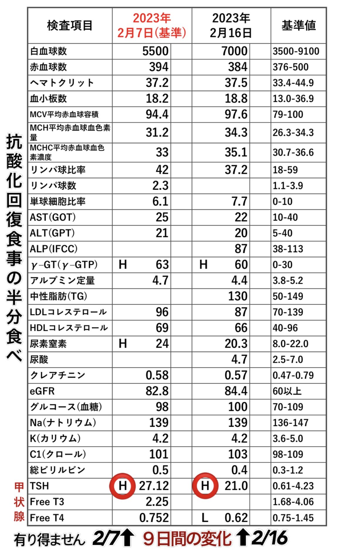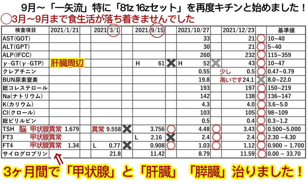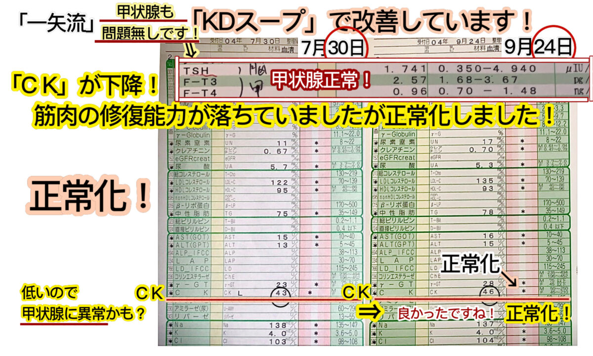 もう25年ずーっと甲状腺ホルモンが悪く、特に「TSH」(基準値0.5〜5.0)の数値は、“142.519”まで上がる異常数値を示していましたが、「81z 16zセット」を中心にその他「一矢流」の食事たちで、急激にみるみる数値が正常化して治っていったのには驚きました❗️