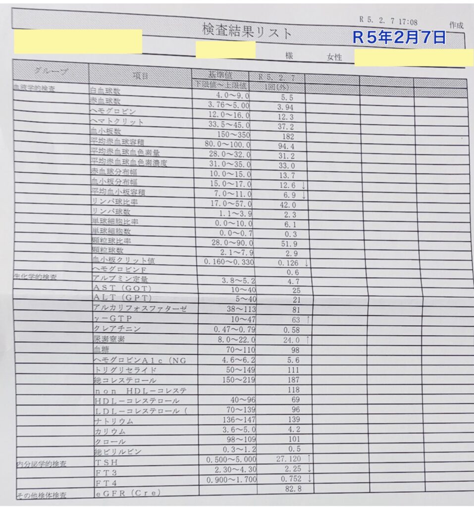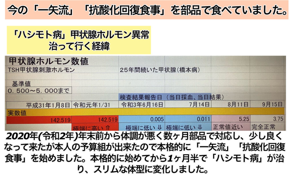 2019年に甲状腺数値『TSH』142.579という異常すぎる数値を治すのに、落ち着くまでに約半年以上かかりましたが、「一矢流」で正常化しています。その後、この異常数値の事を知らない別の病院の医院長に本人がお伺いしたところ、『TSH』が20を超えている時に、「何もしないと半年で死んでしまいます。」と死の宣告をうけています。『100』切った辺りから、薬を飲まず、「一矢流」の食事のみで、ガンガン改善していきました。最後は全て正常化をしました。