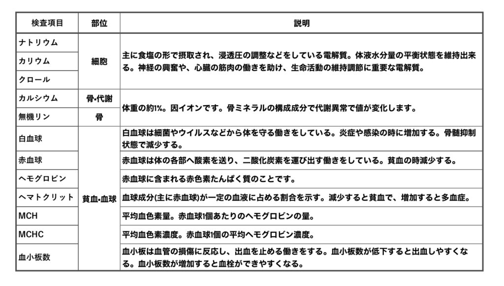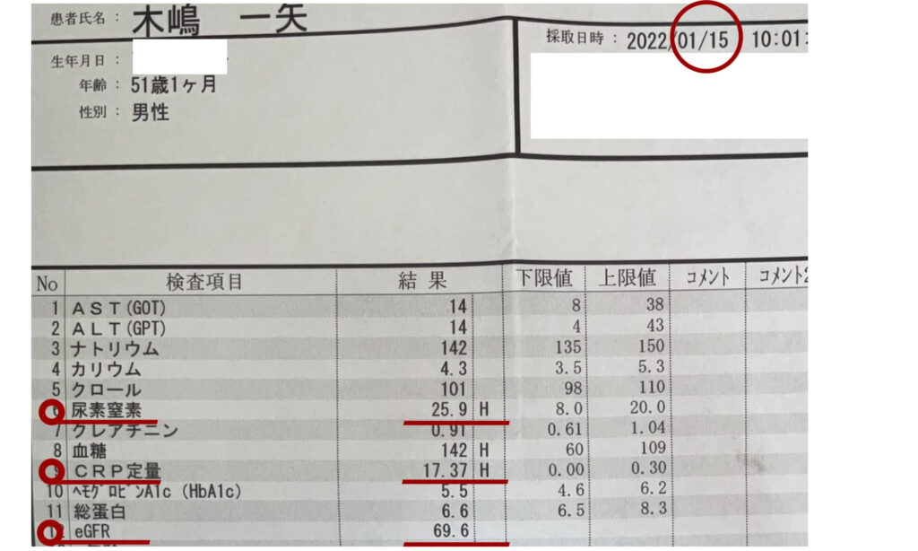 「クレアチニン」…排出したい毒です。数値が高いと毒の体内残量が多いという判断になります。正常排出されていくと腎機能が回復したことになります。