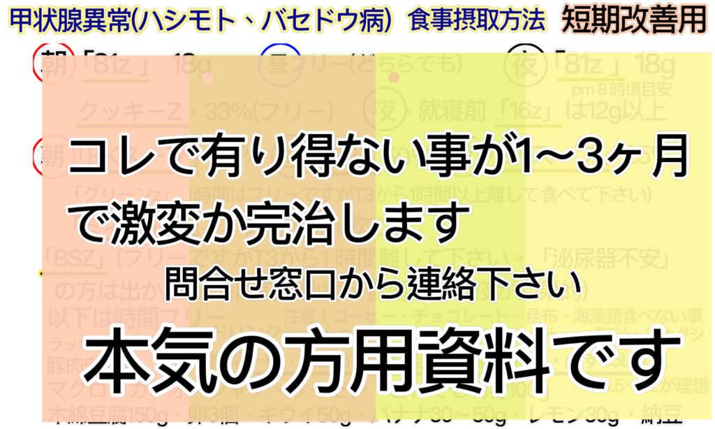 ⬆︎上の資料は、下の資料に10年前からの資料を加えた物になります。最初は、手探りの回復のさせ方だったので時間がかかりましたが、このデータ研究のお陰で、今では早い人は9日間〜。遅くても3ヶ月以内で正常化出来る様になりました。(度合いにもよりますが。)世の中では信じられない一生治らない甲状腺異常と言われています。食べ方はありますが、食べるだけです。