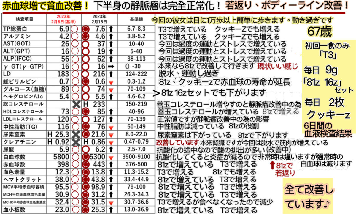 ⬆︎「81z」を毎日6〜9gを中心に、「クッキーz」毎日2枚ずつ、初日のみ「T3」食べました。6日間の数値変化結果❗️