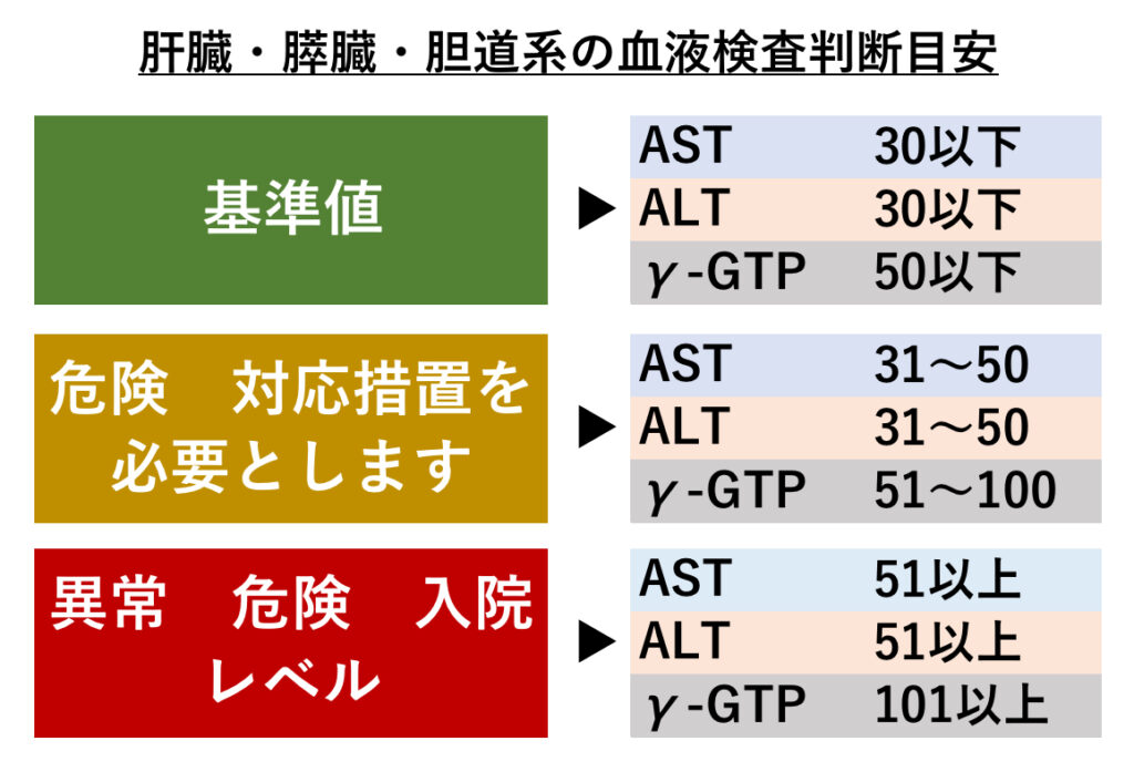 「γ-GT」…肝臓だけではなく、腎臓も膵臓も胆道も悪くなった時に判断する数値になります。この数値でそれぞれ各器官の細胞のどれかが破壊されている場合はこの数値が上がります。この数値を下げる事が解毒・排出効果を上げる事に直結します。かなり広範囲に重要な数値が「γ-GT」です。