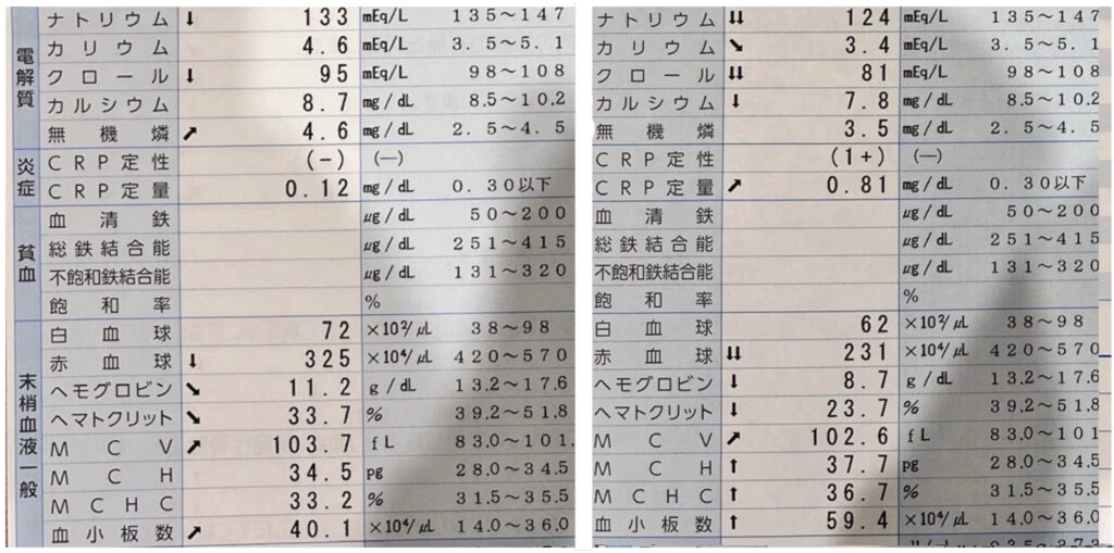 「一矢流」の回復食事を、5月27日〜6月20日まで『25日間』で、歩いて遊べるようになりました。その後の血液検査結果の改善数値が上記になります。全て目を見張るものがありますが、一際目立つのは「AST」「γーgt」や「CK」。肝硬変を一気に治した事になります。ここまで「γーgt」の数値が上がる事はありません。奇跡的に生きていて、通常は死んでいます。良かったですね。